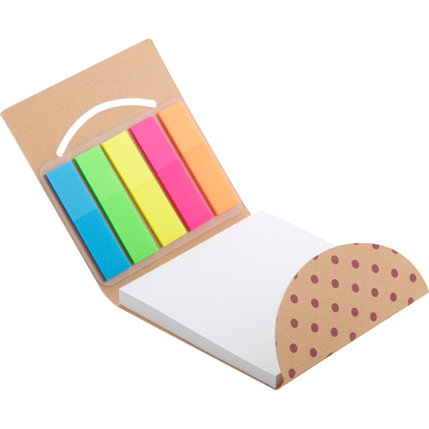 Set plegable y ecológico con etiquetas adhesivas y bloc de notas. Hay un total de 100 etiquetas adhesivas en cinco colores diferentes. Cada etiqueta mide 44 x 12 mm. El bloc de notas mide 75 x 75 mm y consta de 50 hojas con adhesivo en una de las caras. Tanto el bloc de notas como la cubierta están fabricados con papel reciclado.