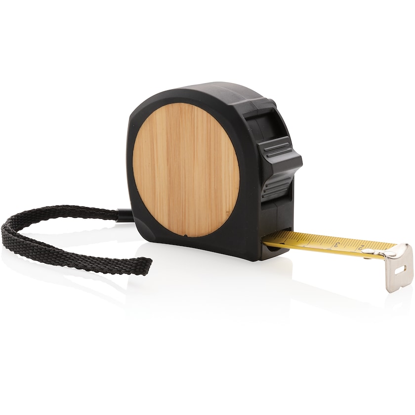 Cinta métrica de 5 m con elegante detalle en bambú auténtico. La cinta métrica tiene un botón de bloqueo y viene en una bonita caja de regalo. Se puede personalizar con impresión o grabado láser.