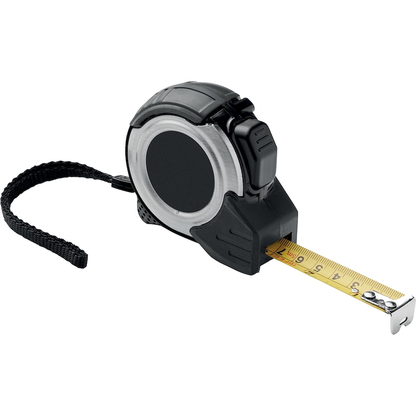 Sólida cinta métrica de gran calidad. La cinta métrica tiene una estructura resistente a golpes con detalles de goma y bloqueo automático. La impresión se realiza con impresión digital bajo una capa protectora de epoxi.