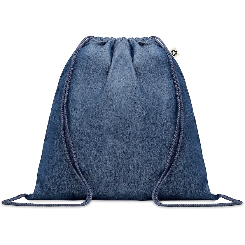 Mochila de cuerdas de tejido vaquero ecológico. El tejido está fabricado con un 50% algodón reciclado y un 50% algodón normal. El vaquero le da a la mochila un aspecto moderno y llamativo.