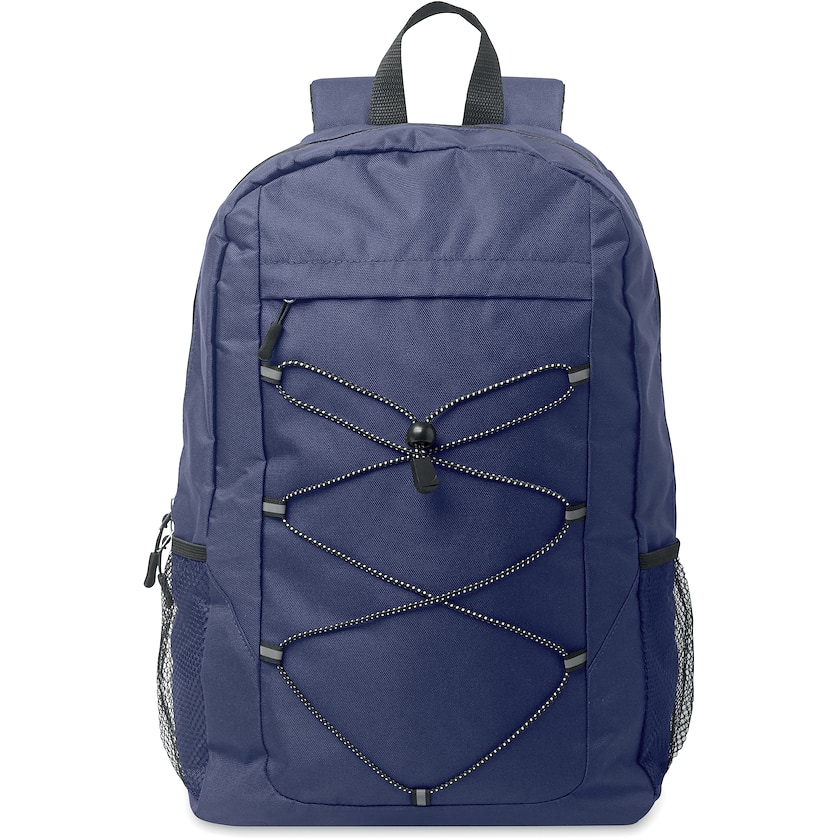 Mochila con tejido de material reciclado. Además del compartimento principal, tiene un bolsillo delantero con cremallera. En los laterales tiene bolsillos de red.