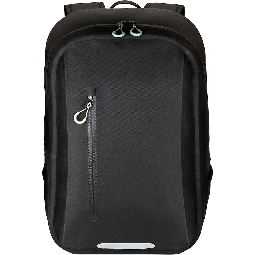 Mochila impermeable para ordenador. En el interior hay un compartimento acolchado para un ordenador portátil de 15 pulgadas que se puede extraer. La mochila tiene costuras con sellado térmico, lo que la hace resistente a la humedad. Tiene bolsillos en la parte delantera y en los laterales. Solo es posible la impresión en un color.