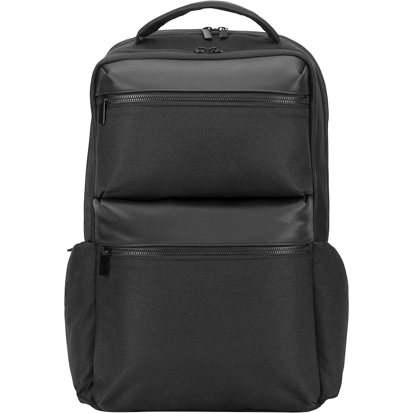 Mochila para ordenador con tejido repelente al agua. En la parte delantera hay dos bolsillos grandes y en los laterales dos bolsillos más pequeños, todos con cremallera. La parte trasera tiene un acolchado adicional. En el interior hay un compartimento acolchado para un portátil de 17,3 pulgadas. El material interior y exterior está fabricado con poliéster reciclado.
