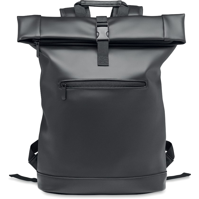Mochila roll-top de material suave. Tiene un espacio para un portátil de 15 pulgadas. La espalda está acolchada y la base reforzada para mayor durabilidad. El forro es de rPET ecológico. Se puede personalizar con impresión en un color.