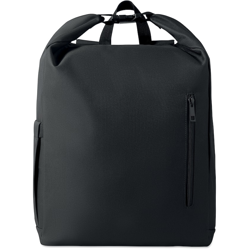 Mochila con cierre enrollable fabricada con tejido rPET ecológico. En el interior hay un compartimento acolchado para un portátil de 15 pulgadas. En la parte delantera hay un bolsillo con cremallera y en un lateral hay un bolsillo lateral elástico.