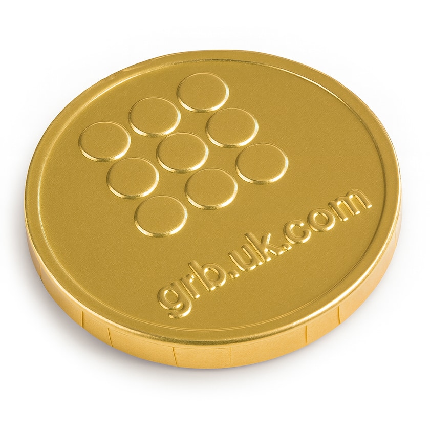 Moneda de chocolate con motivo en relieve. La moneda tiene papel de aluminio dorado y es de delicioso chocolate con leche. El grabado en relieve se realiza por defecto solo en un lado. Si quieres personalizar ambos lados, se añadirá un coste adicional. Solo se venden en paquetes de 3600 unidades. El dulce favorito de cualquier niño.