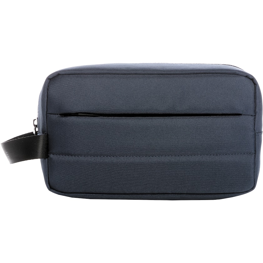 Neceser ecológico fabricado con botellas PET recicladas. Además del compartimento principal, tiene un bolsillo con cremallera en la parte frontal para objetos pequeños. No contiene PVC. Una opción respetuosa con el medio ambiente.