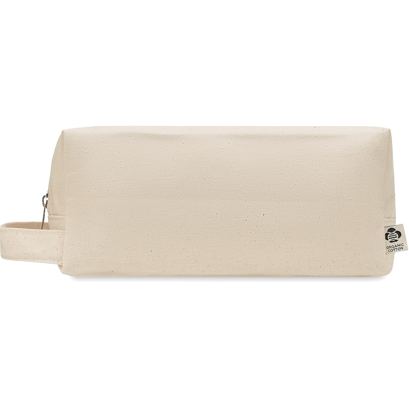 Neceser pequeño de algodón ecológico. Una buena opción para el entorno. Una etiqueta indica que está fabricado con algodón ecológico.