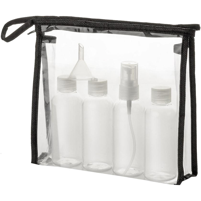 Set de viaje con cuatro recipientes para cosméticos, jabón y champú. Los recipientes tienen una capacidad de 8 cl para poder llevarlos a bordo en el avión. Perfectos para una escapada de fin de semana.
