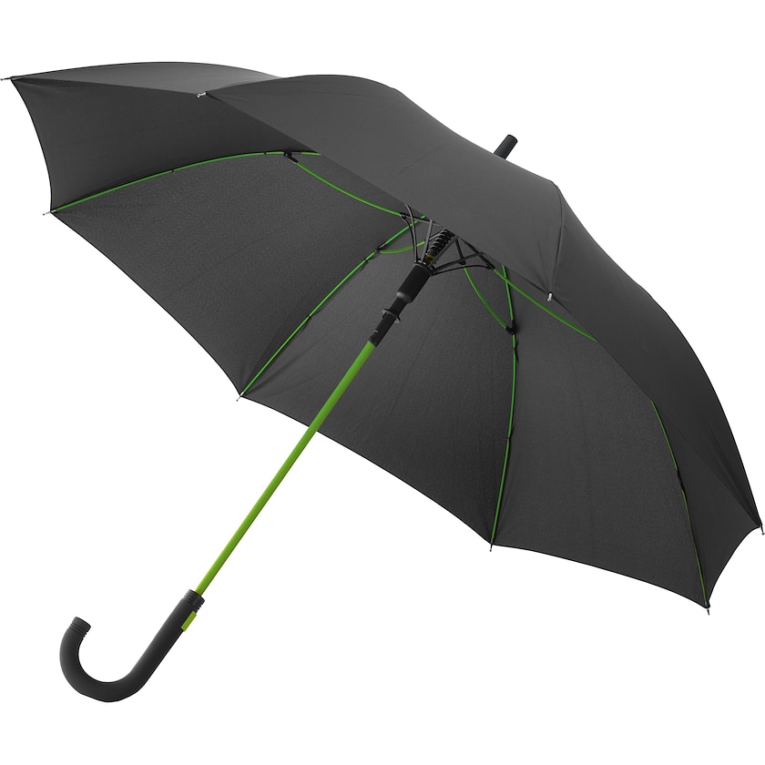 Paraguas resistente con el eje de otro color. Las varillas son de fibra de vidrio y el mango tiene la superficie de goma. Un paraguas único y de buena calidad.