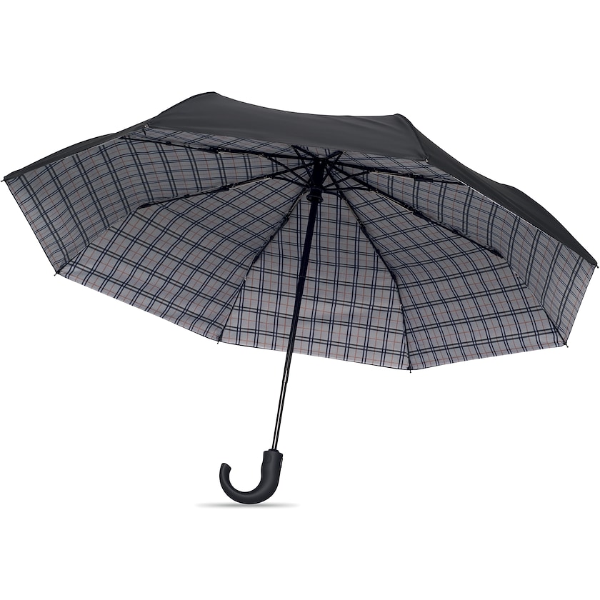 Paraguas compacto resistente a las tormentas con interior de cuadros. Las varillas son de fibra de vidrio resistente. El mango es de madera. Apertura y cierre automáticos.