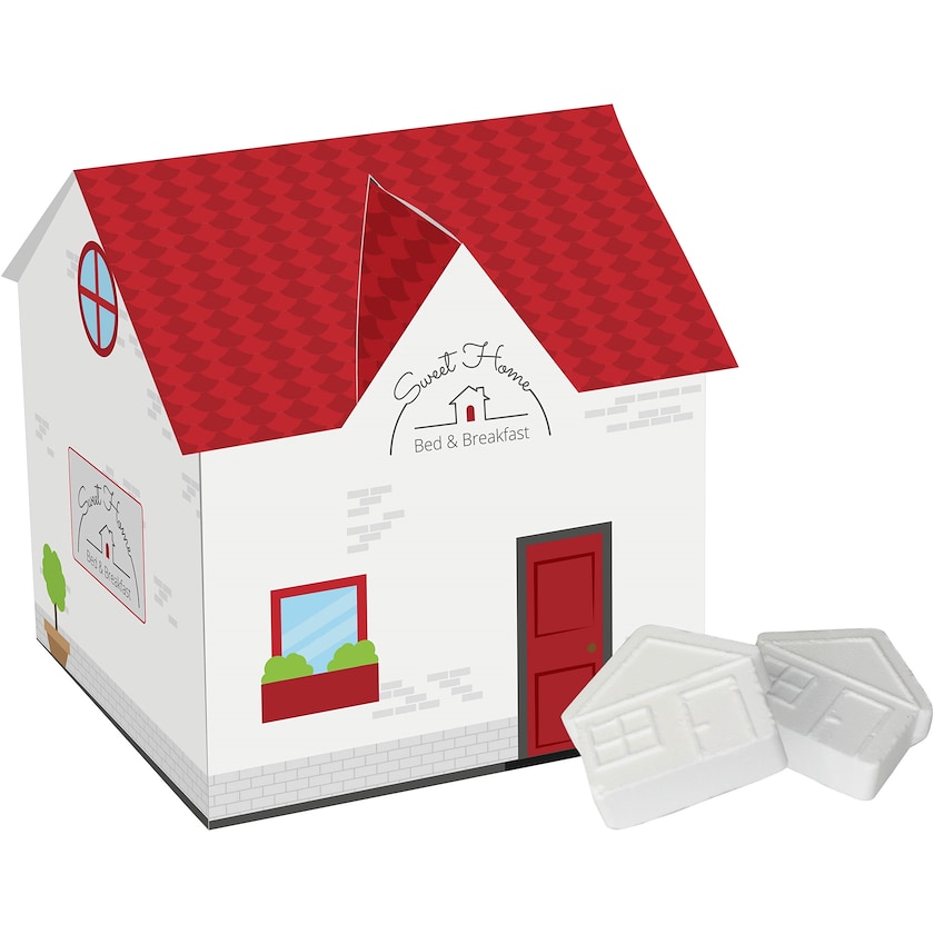 Pastillas de menta de 80 gramos en una caja de papel con forma de casa. La casa se personaliza entera con tu diseño. Descarga la plantilla de impresión y da rienda suelta a tu creatividad.