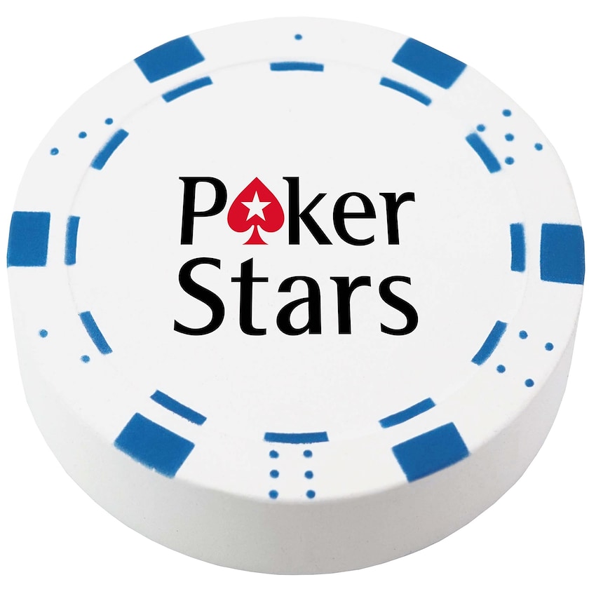 Pelota antiestrés con forma de ficha de póker. La impresión azul está preimpresa en todas las pelotas antiestrés. Un producto publicitario divertido para empresas de juego.