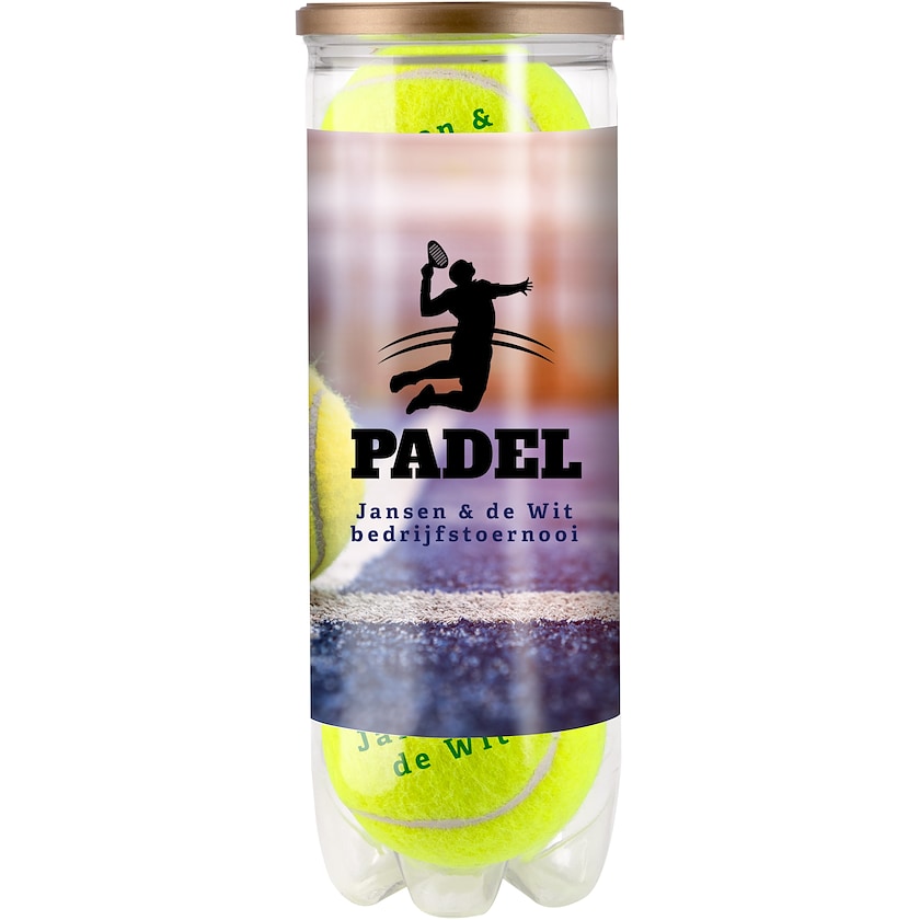 Juego de tres pelotas de pádel con estampado y etiqueta con su propio diseño. El precio de impresión incluye la impresión en las tres pelotas de pádel y la etiqueta. Las pelotas de pádel están presurizadas con gas y se producen en Europa.