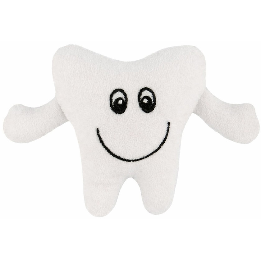 Peluche con forma de diente. Los ojos y la boca están bordados. Tu estampado se coloca en la parte trasera del peluche.
