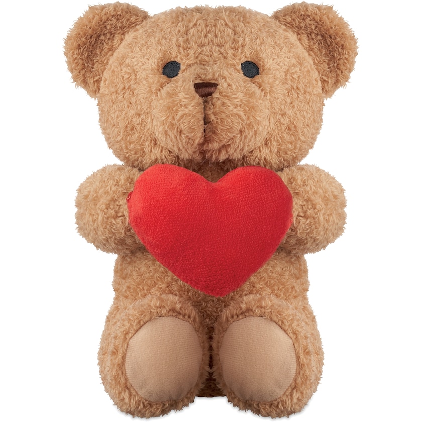 Osito sosteniendo un corazón rojo. Los ojos, la nariz y la boca del osito están bordados.