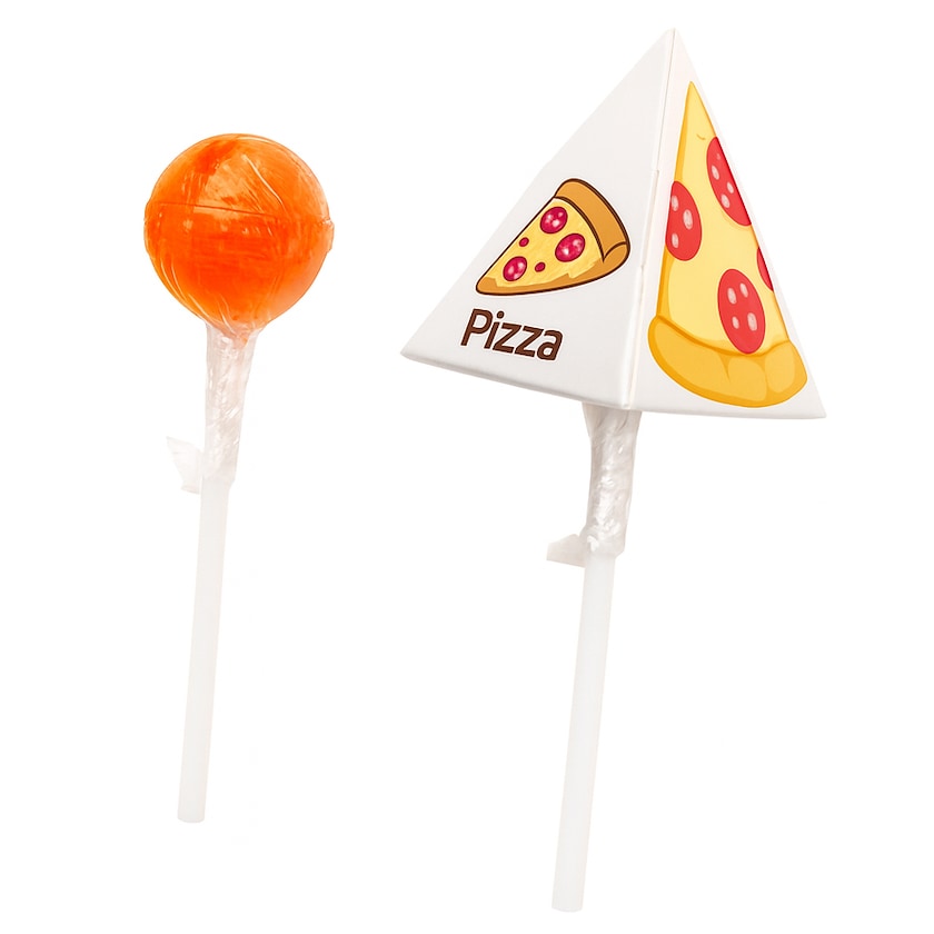 Piruleta en envase personalizado con forma de pirámide. Las piruletas vienen en una mezcla de sabores de limón, manzana, fresa y naranja. Dentro del envase de cartón, las piruletas están cerradas con una lámina de plástico transparente para mejor conservación.