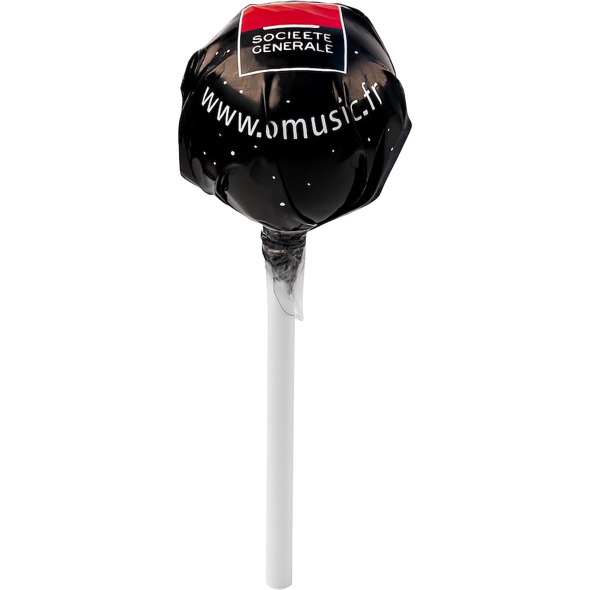 Clásica piruleta de 13 gramos personalizada. La piruleta está disponible en muchos sabores diferentes como mandarina, lima y cereza. La cantidad mínima por sabor es de 4000 unidades.