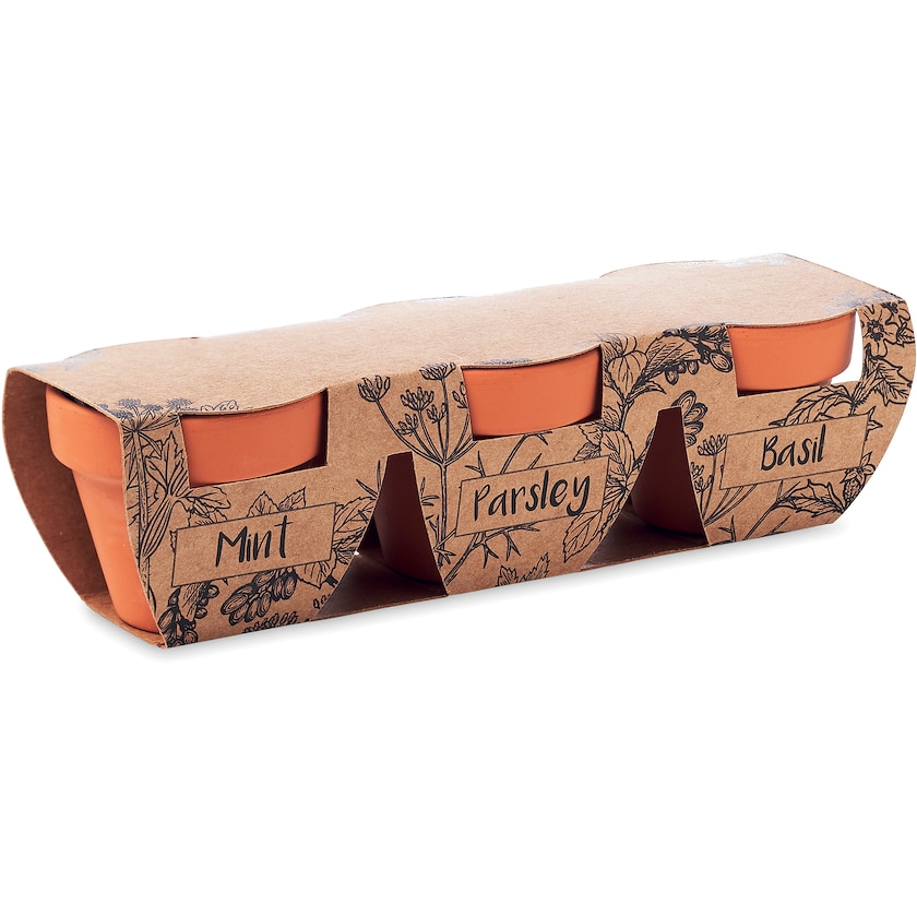 ¡Cultiva tu pequeño jardín de hierbas culinarias! Kit con tres macetas que contienen semillas para cultivar menta, perejil y albahaca. Dales un sabor único a tus platos. Fabricado en la UE. Se personaliza con impresión en un color.