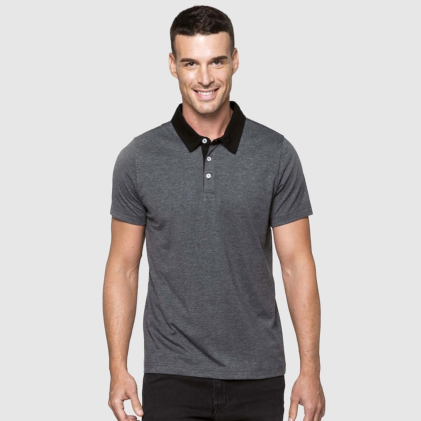 Polo con elegantes detalles en contraste en el cuello. El polo es de algodón 100% excepto el color gris oscuro jaspeado, que está fabricado en 65% poliéster y 35% algodón. Se entregan en bolsas de plástico individuales. También disponible como modelo de mujer.