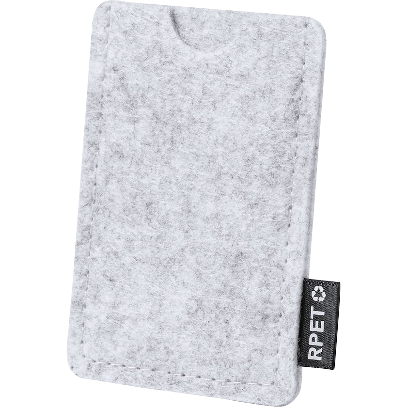 Tarjetero de fieltro de rPET ecológico. El tarjetero tiene un bolsillo y una etiqueta que indica que está fabricado con rPET.