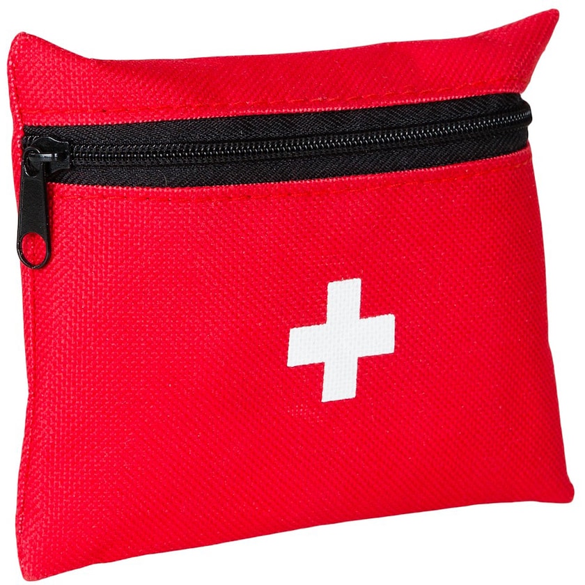 Kit de primeros auxilios con lo más importante para accidentes. Contiene, entre otras cosas, 10 tiritas, 4 desinfectantes, vendas, algodones y tijeras.