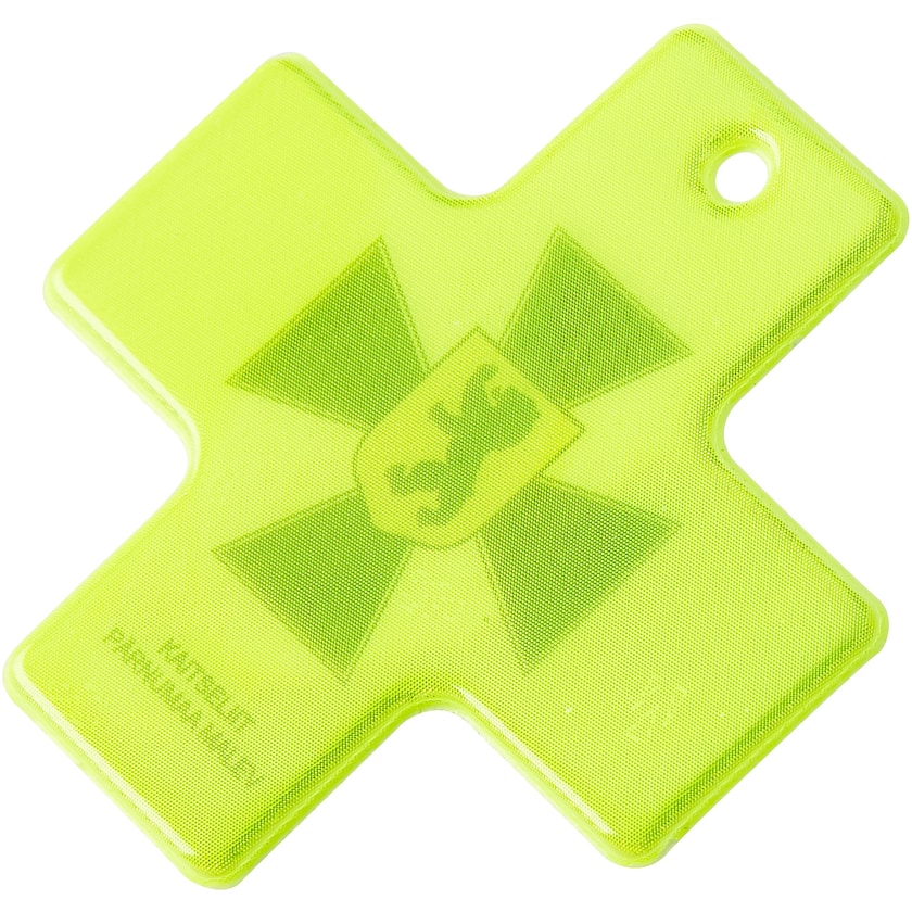 Reflectante blando con forma de cruz. Se entrega con una cuerda y un imperdible o con cadena de metal. El material reflectante cumple con la normativa EN13356:2001 y está disponible en blanco o amarillo. La impresión siempre se realiza bajo la superficie reflectante.