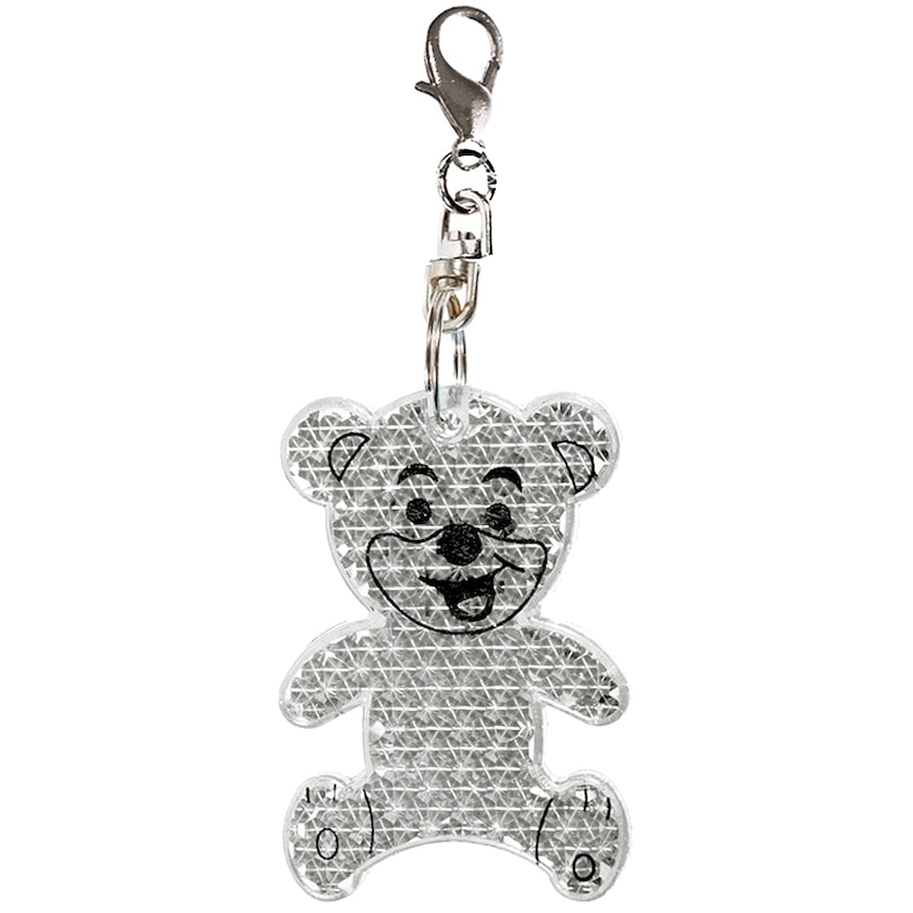 Reflectante rígido con forma de osito. El reflectante tiene un gancho para poder fijarlo, por ejemplo, a una mochila.