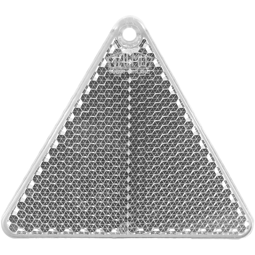 Reflector triangular de plástico duro. La chapa reflectante está fabricada en Europa y cumple los requisitos de la norma CE EN 17353:2020 B1. Se suministra con cordón e imperdible o con cadena de bolas.
