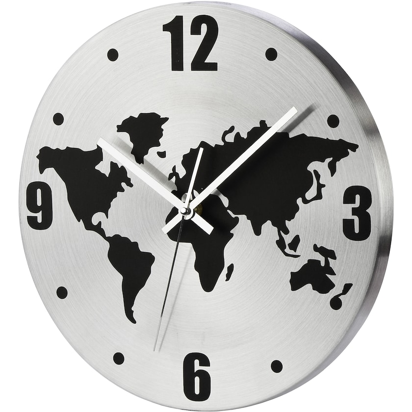 Bonito reloj de pared de metal con el mapa del mundo. Un reloj que decora tu hogar.