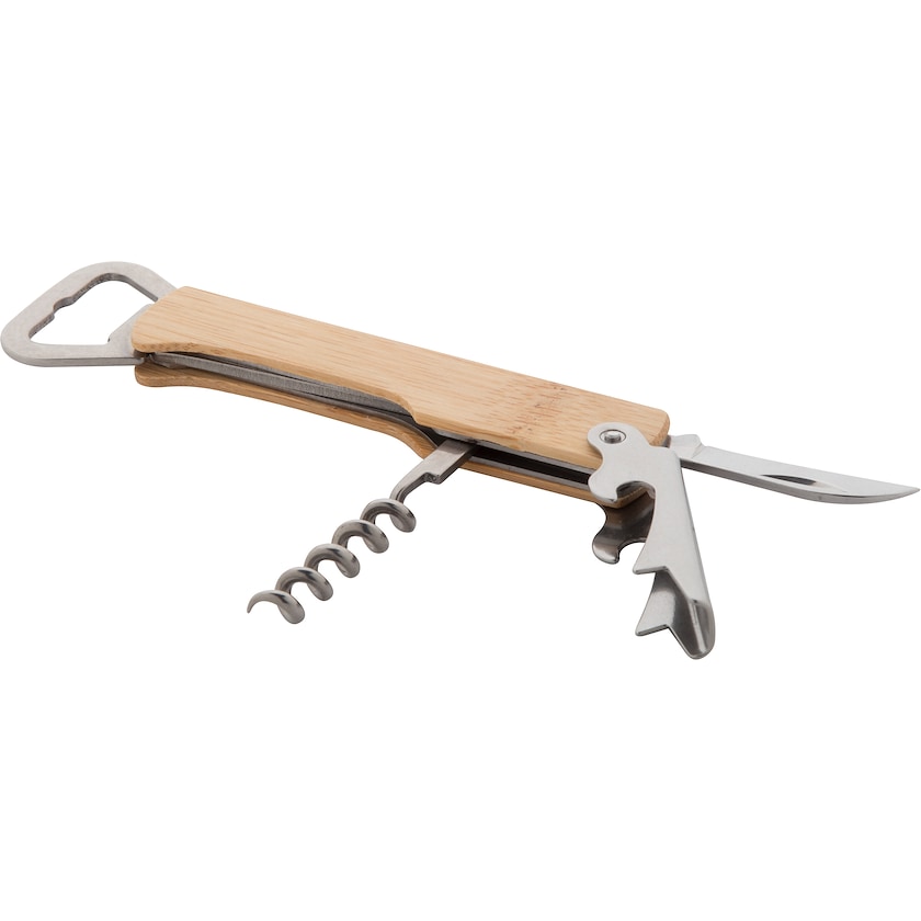 Abridor de vino de acero inoxidable y bambú. Tiene descorchador, navaja y tres tipos de abridores de cápsulas. Viene en una caja de regalo marrón.