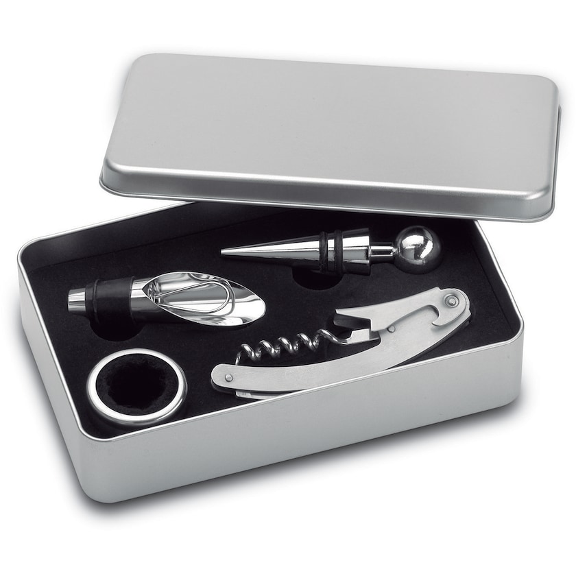 Set de sacacorchos con cuatro accesorios en una elegante caja de regalo metálica. El marcado se realiza con impresión o con grabado láser.