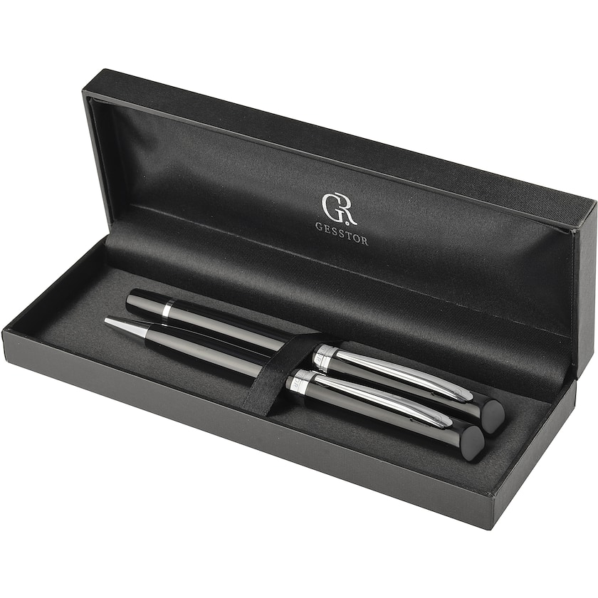 Set de escritura con diseño clásico. El set contiene dos bolígrafos de metal. Ambos bolígrafos tienen tinta negra. El precio del grabado láser hace referencia al marcado en uno de los bolígrafos.