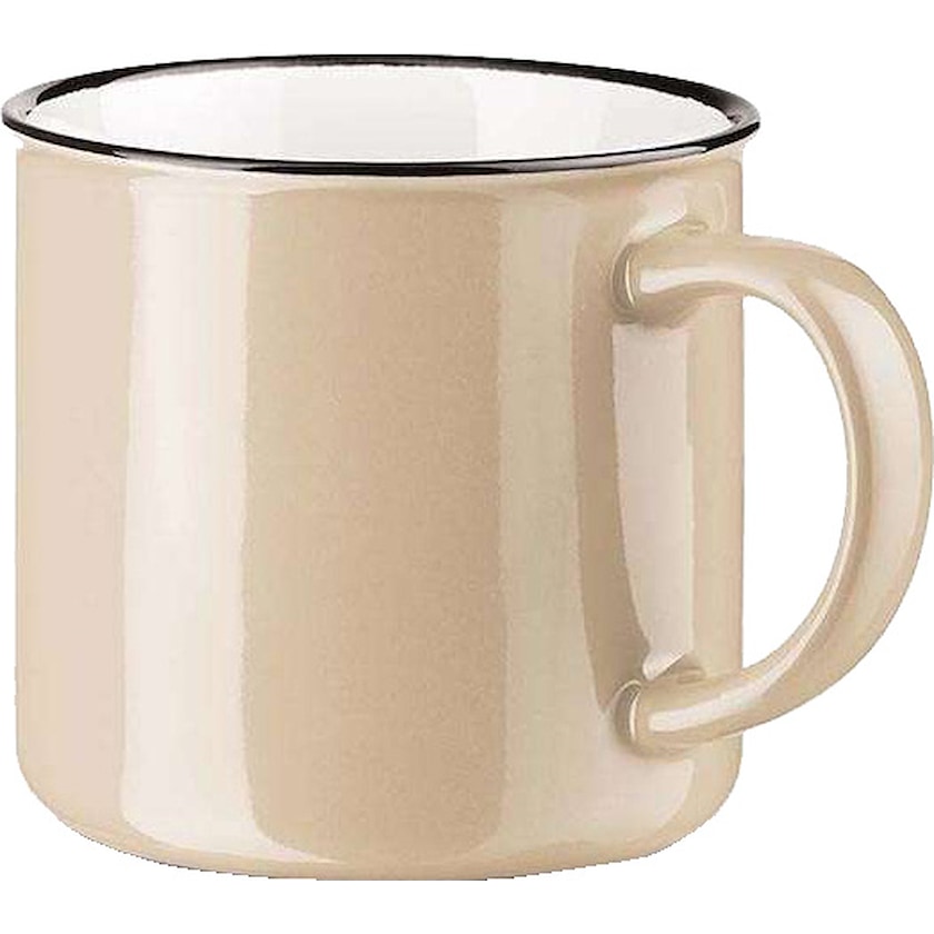 Taza de cerámica con un diseño de inspiración retro. El diseño está inspirado en las clásicas tazas esmaltadas. Tiene una superficie de impresión amplia y está disponible en varios colores. Se debe lavar a mano.