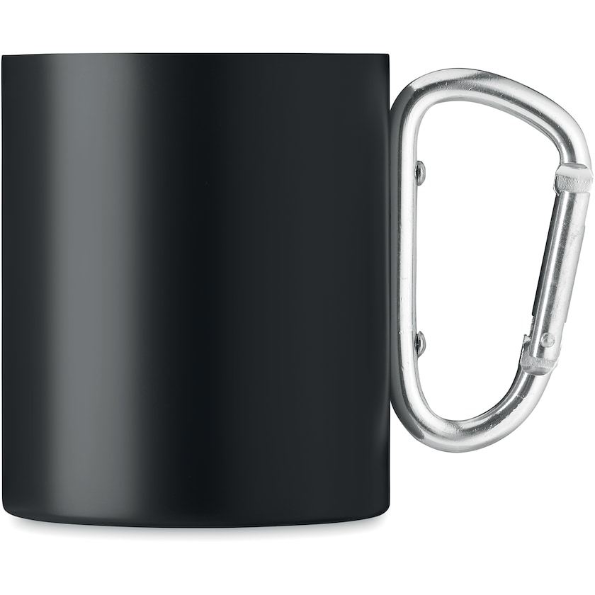 Taza de acero inoxidable con un mosquetón como asa. La taza tiene doble pared para mantener la bebida caliente más tiempo.