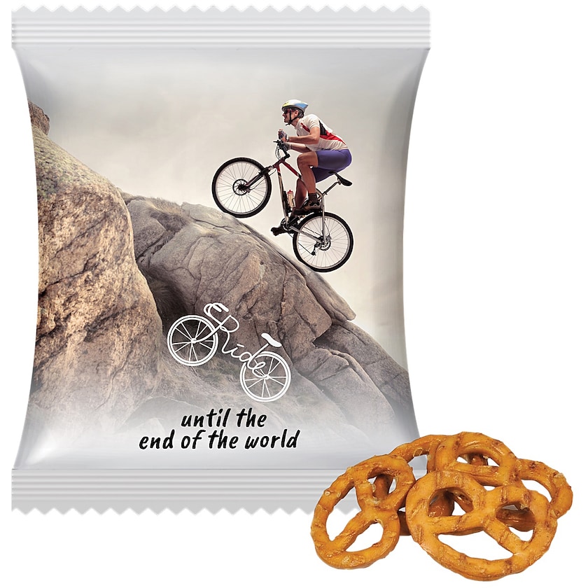 10 gramos de pretzels salados. Vienen en envases individuales personalizados. Una buena alternativa para compartir en ferias.