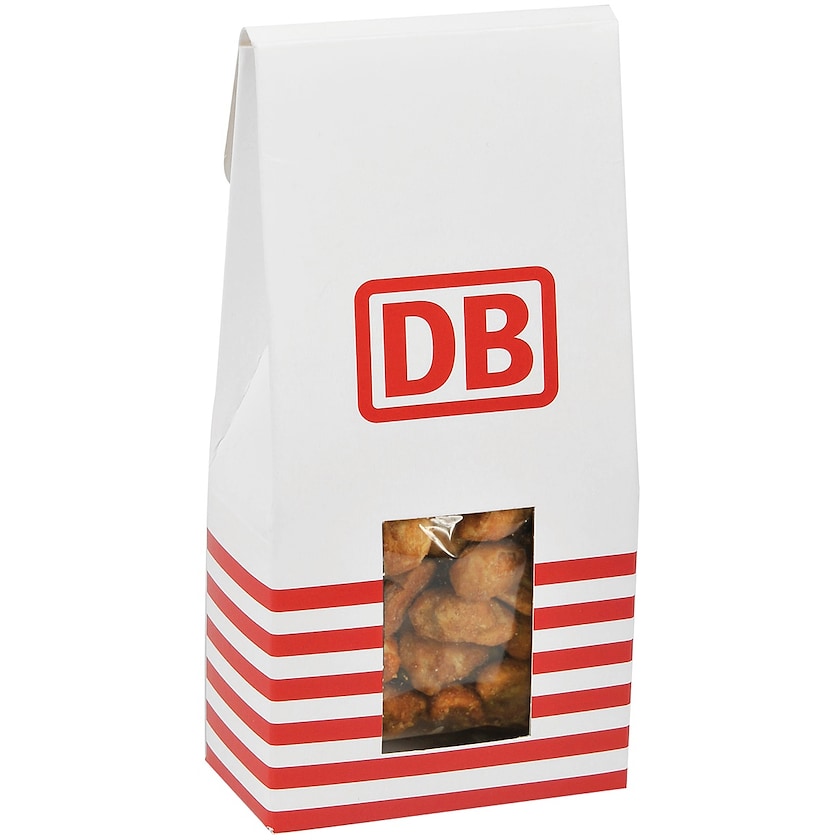 40 gramos de cacahuetes garrapiñados en envase personalizado. Los cacahuetes tienen un sabor delicioso y son perfectos para compartir con clientes y empleados. Descarga la plantilla de impresión y diseña un envase único.