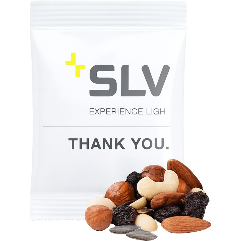 Deliciosa mezcla de frutos secos en envase personalizado. Contiene una mezcla de anacardos, almendras, pasas, avellanas, pipas de calabaza y cacahuetes. Todo el envase se personaliza con tu diseño.