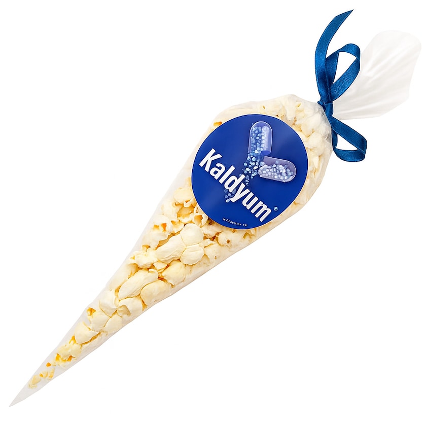 Bolsa cónica de palomitas de maíz saladas. La bolsa está hecha con una lámina de plástico transparente y se cierra con una cinta disponible en varios colores. Sobre la bolsa se coloca una pegatina redonda con tu impresión.