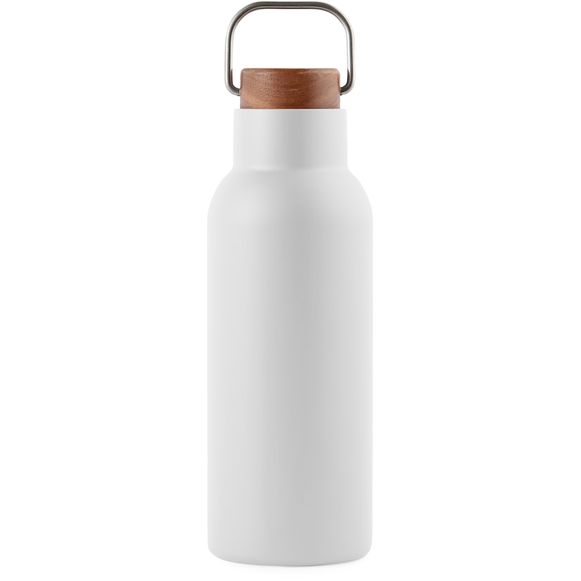 Termo elegante de acero inoxidable con certificado RCS. El tapón es de madera de acacia y tiene un asa de metal. El termo tiene doble pared, lo que permite mantener la bebida fría o caliente más tiempo.