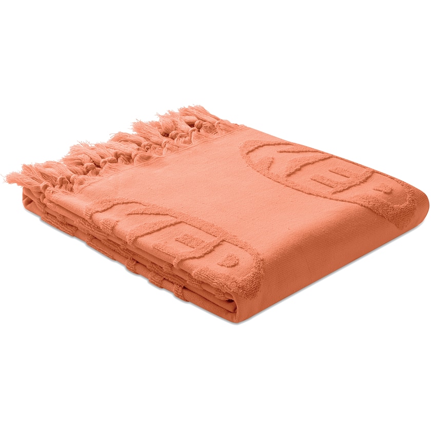 Toalla hammam con flecos anudados y tu diseño tejido en relieve. El tejido pesa 320 g/m² y es de 100% algodón. Tú eliges el color de la toalla con el código Pantone que desees. El diseño se ve por un lado en relieve y por otro en bajorrelieve. La cantidad que se envía puede diferir +/- 10% de la cantidad pedida (se factura la cantidad entregada).