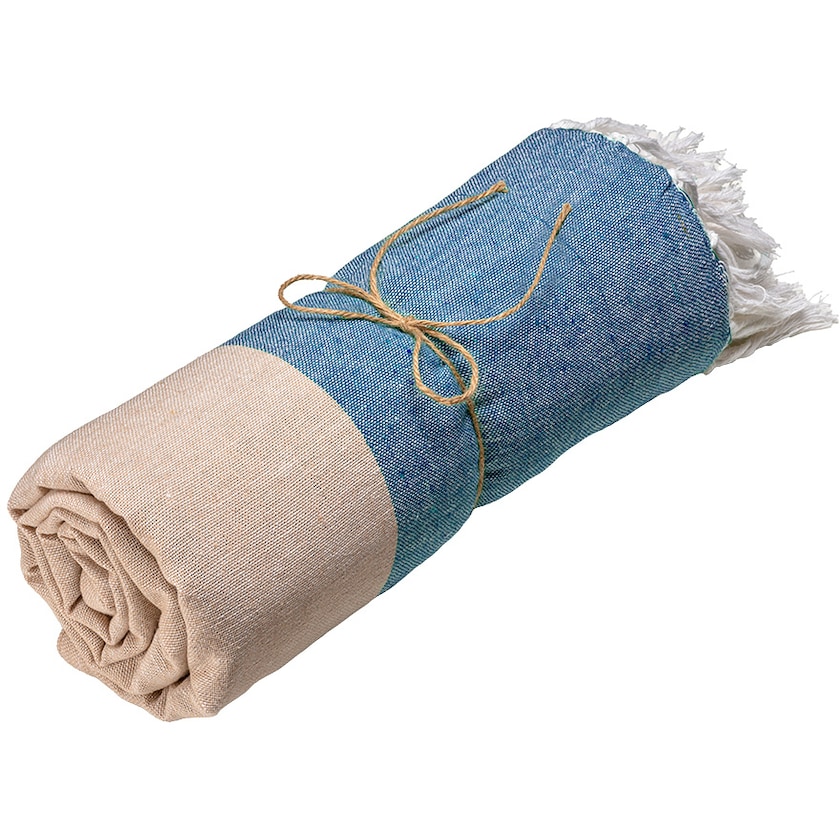 Toalla de playa bicolor confeccionada con un tejido de algodón reciclado de 180 gramos. Ideal para los días de relax en la playa.
