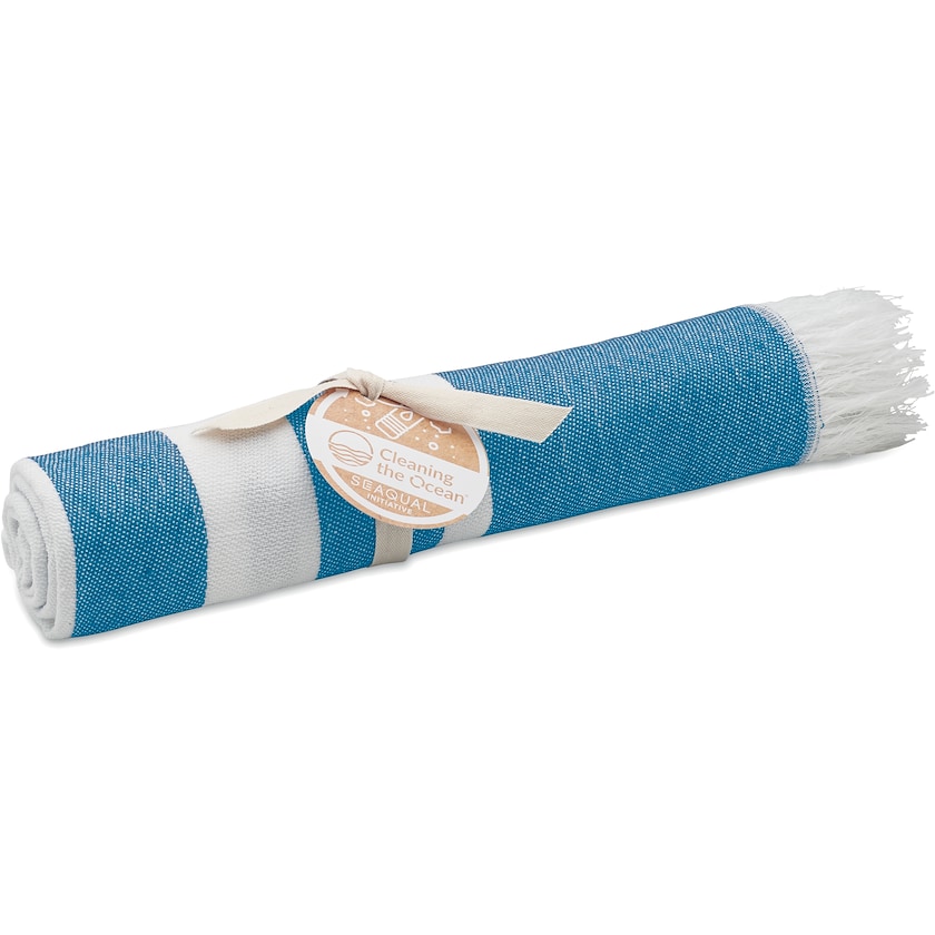 Toalla hammam de material reciclado. La toalla está fabricada de 70% algodón reciclado y 30% poliéster reciclado de tipo hilo Seaqual®. Se fabrica en la UE.